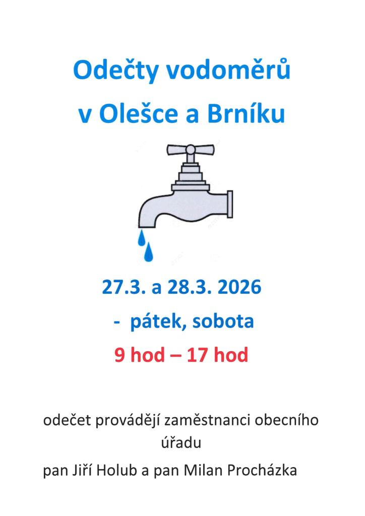 Odečty vodoměrů - 27.3. - 28.3.2026 od 9:00 - 17:00 hodin.