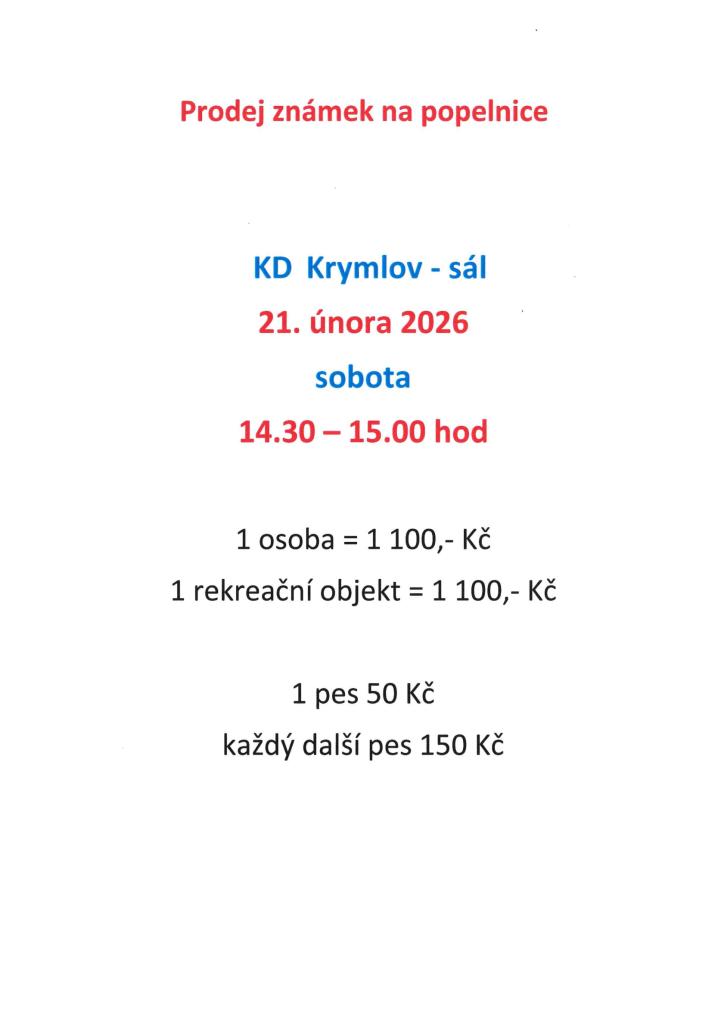 V sobotu 21.2.2026 od 14:30 - 15:00 hodin prodej známek na popelnice v KD Krymlov.